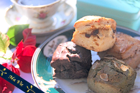 スコーン4個:「ダブルチョコ」「フランボワーズ」「濃い抹茶」「ラムレーズン・オレンジ」